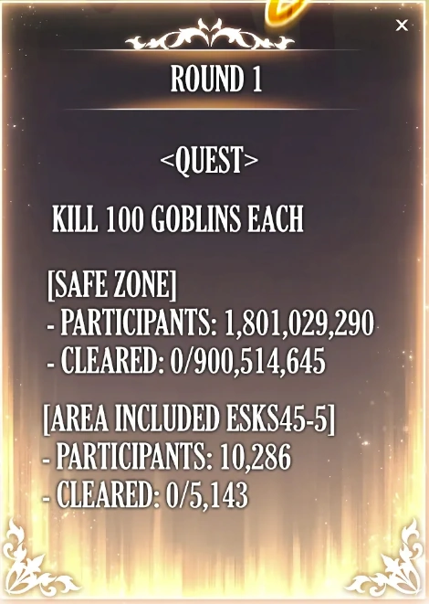 Round 1 marked the beginning of a deadly survival game involving approximately 1.8 billion participants aged 15 to 29 from around the globe. Players were transported to a vast meadow and tasked with defeating 100 goblins each to clear the round. Only the first 50% of participants to achieve the objective were allowed to survive and return to Earth.